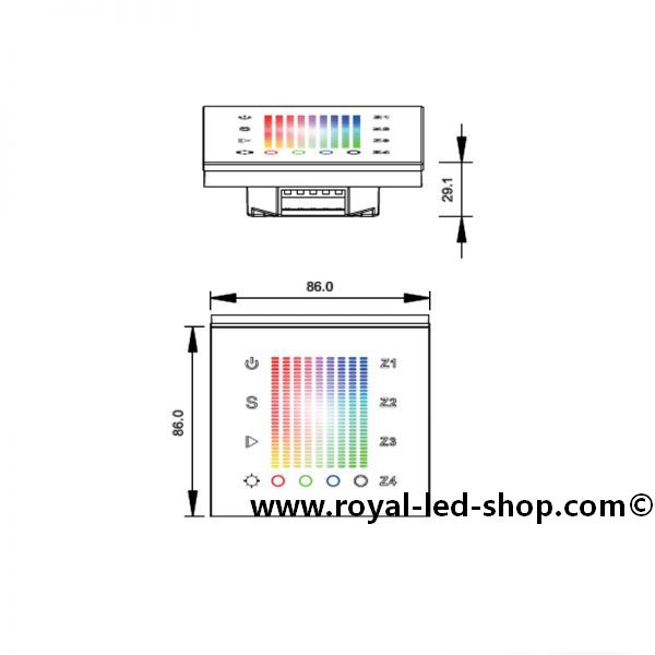 Dimmspezifikation: , stufenlos dimmbar, stufenlose Auswahl RGBW easy touch, Frequenz: 434Mhz/868MHz, 4 Zone, RGBW, Funk-Wand-Controller, Stromnetzanschluss, einlernbar auf alle Sys-One Steuerunge